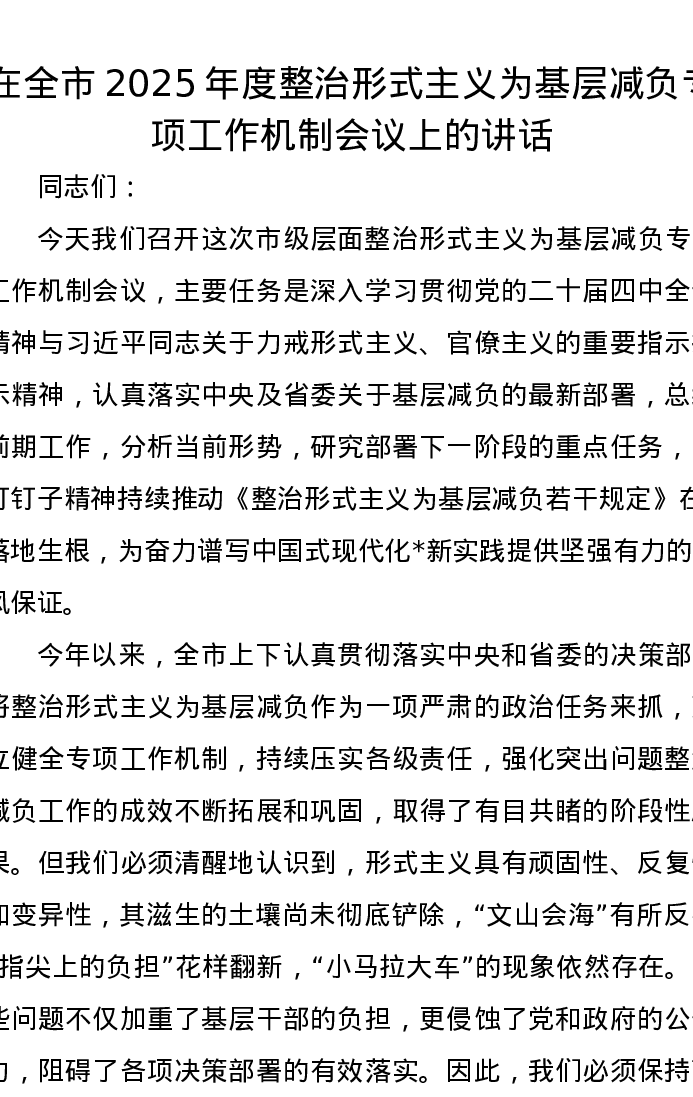 在全市2025年度整治形式主义为基层减负专项工作机制会议上的讲话