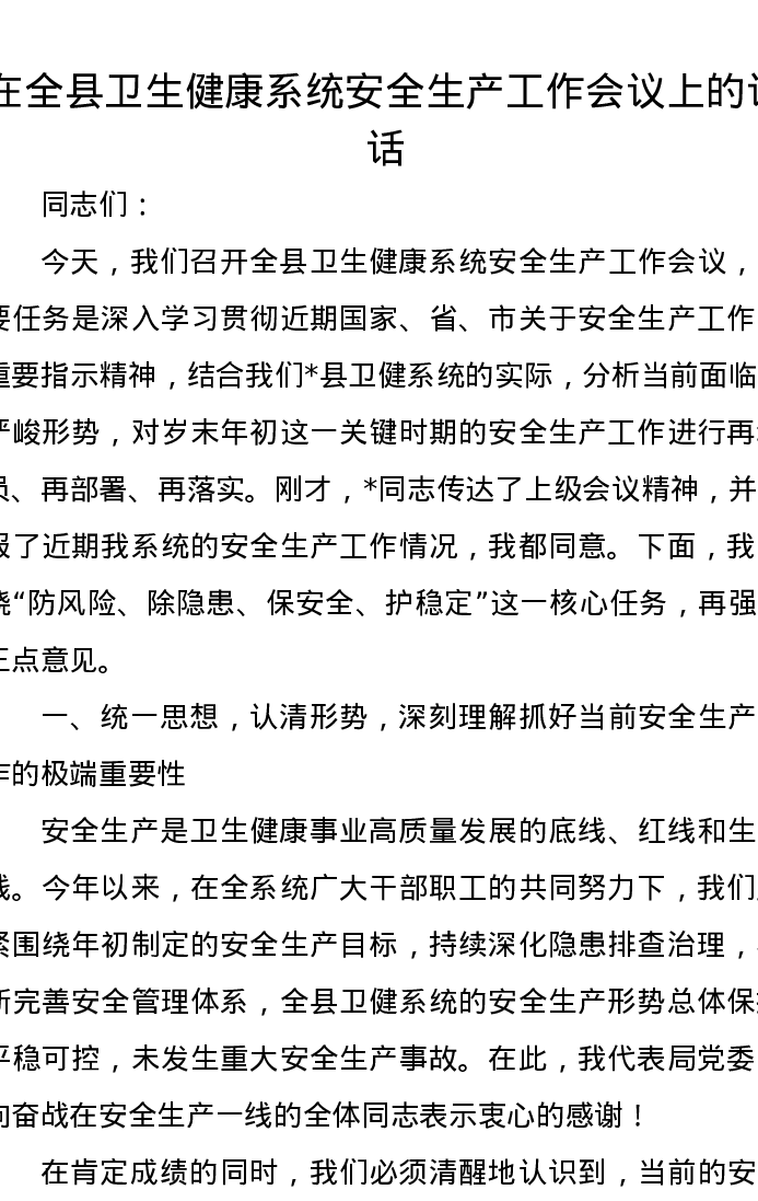 在全县卫生健康系统安全生产工作会议上的讲话