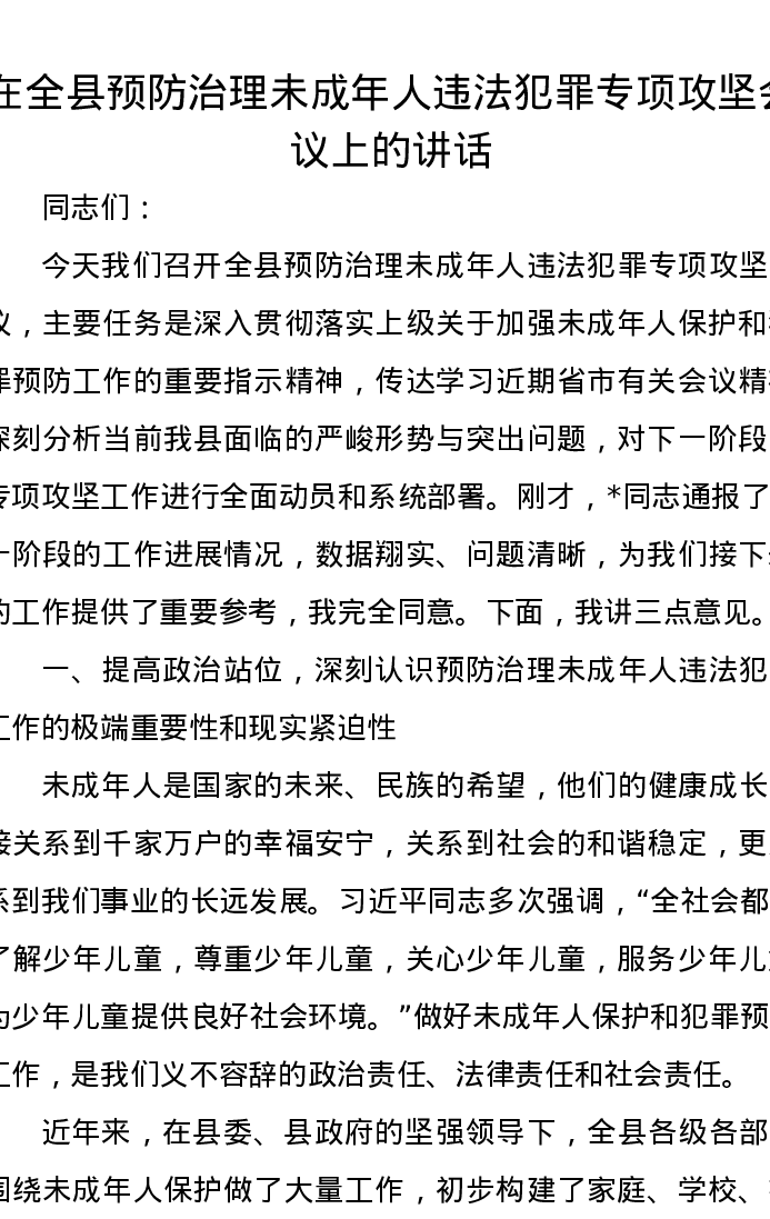 在全县预防治理未成年人违法犯罪专项攻坚会议上的讲话