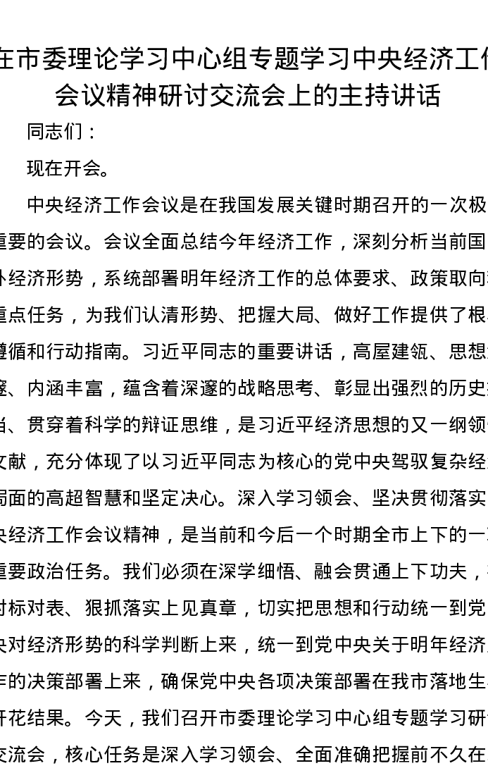 在市委理论学习中心组专题学习中央经济工作会议精神研讨交流会上的主持讲话