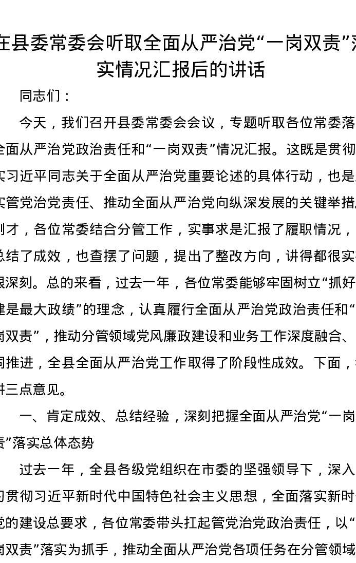 在县委常委会听取全面从严治党“一岗双责”落实情况汇报后的讲话
