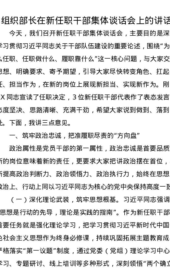 组织部长在新任职干部集体谈话会上的讲话