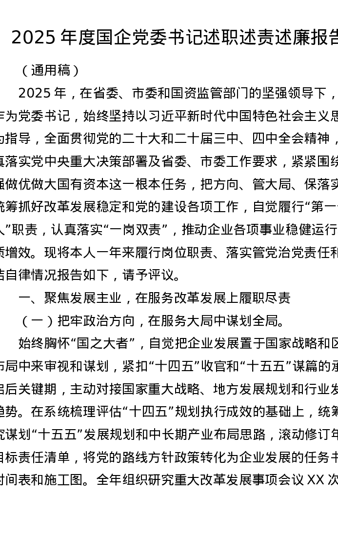 2025年度国企党委书记述职述责述廉报告(通用稿)