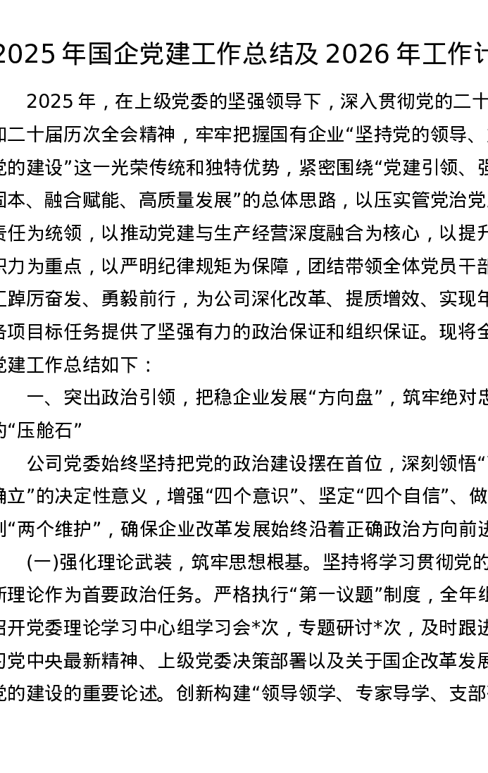 2025年国企党建工作总结及2026年工作计划