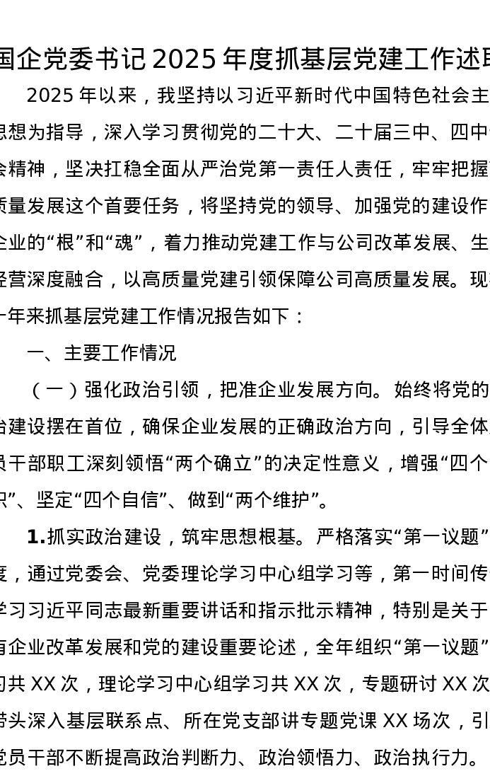 国企党委书记2025年度抓基层党建工作述职