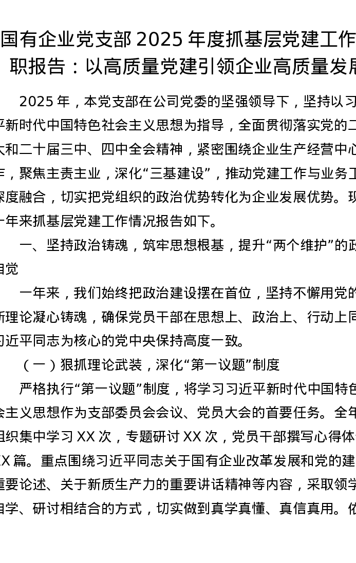 国有企业党支部2025年度抓基层党建工作述职报告:以高质量党建引领企业高质量发展