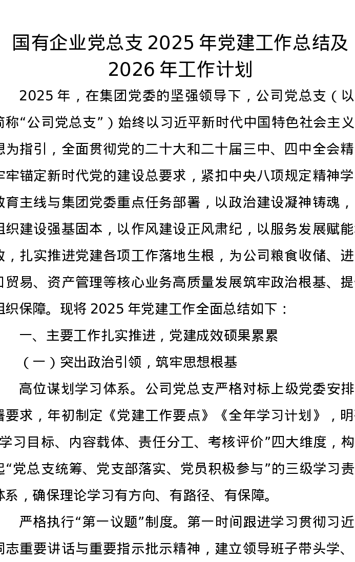 国有企业党总支2025年党建工作总结及2026年工作计划