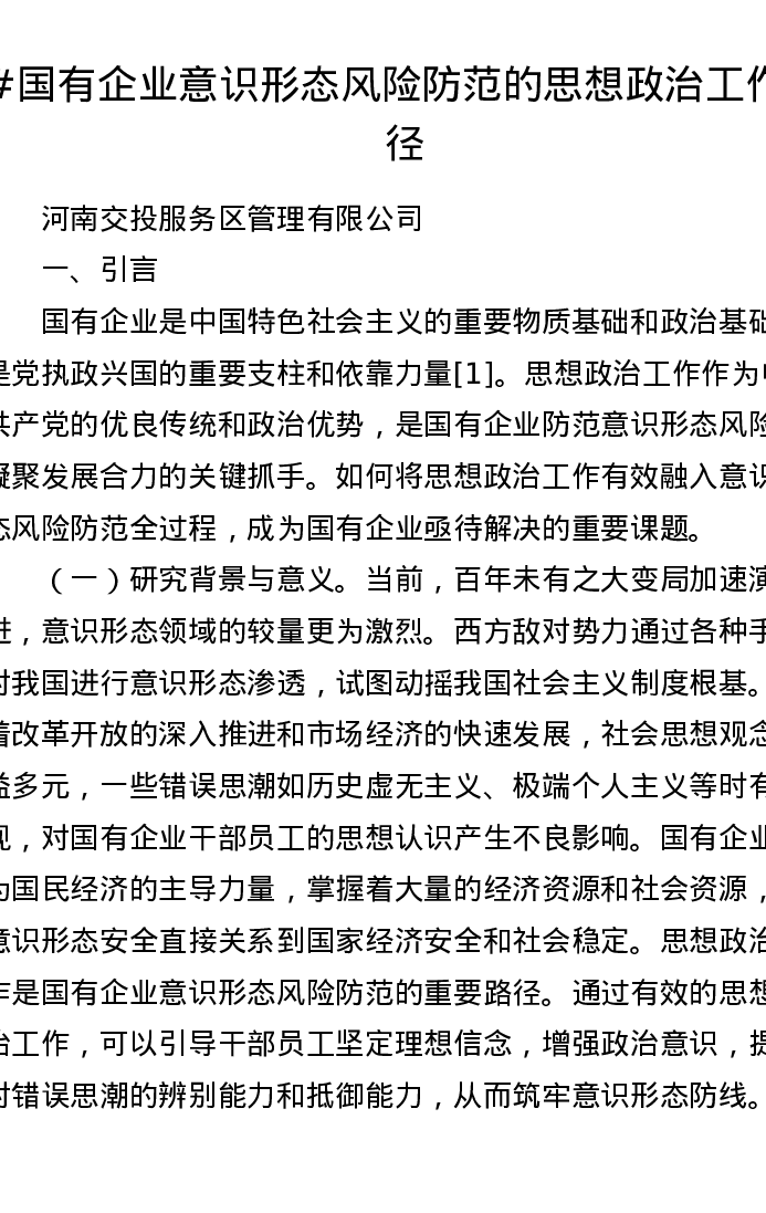 调研报告:国有企业意识形态风险防范的思想政治工作路径