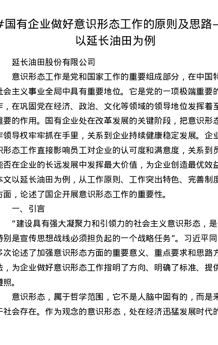调研报告:国有企业做好意识形态工作的原则及思路——以延长油田为例