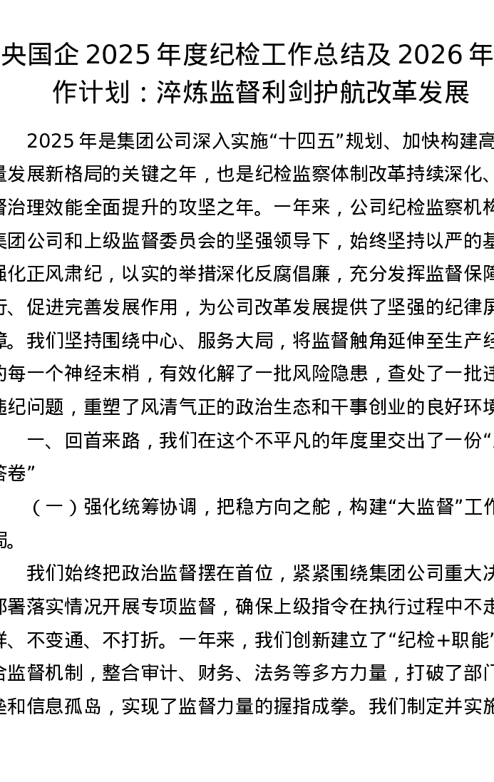 央国企2025年度纪检工作总结及2026年工作计划:淬炼监督利剑 护航改革发展