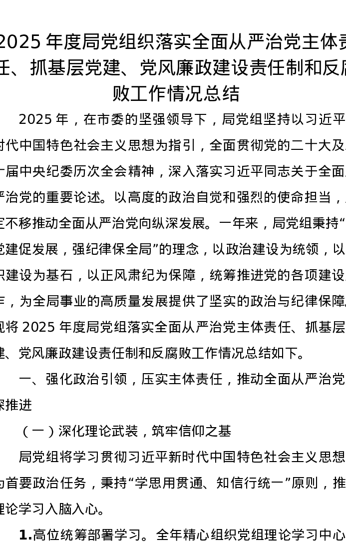 2025年度局党组织落实全面从严治党主体责任、抓基层党建、党风廉政建设责任制和反腐败工作情况总结