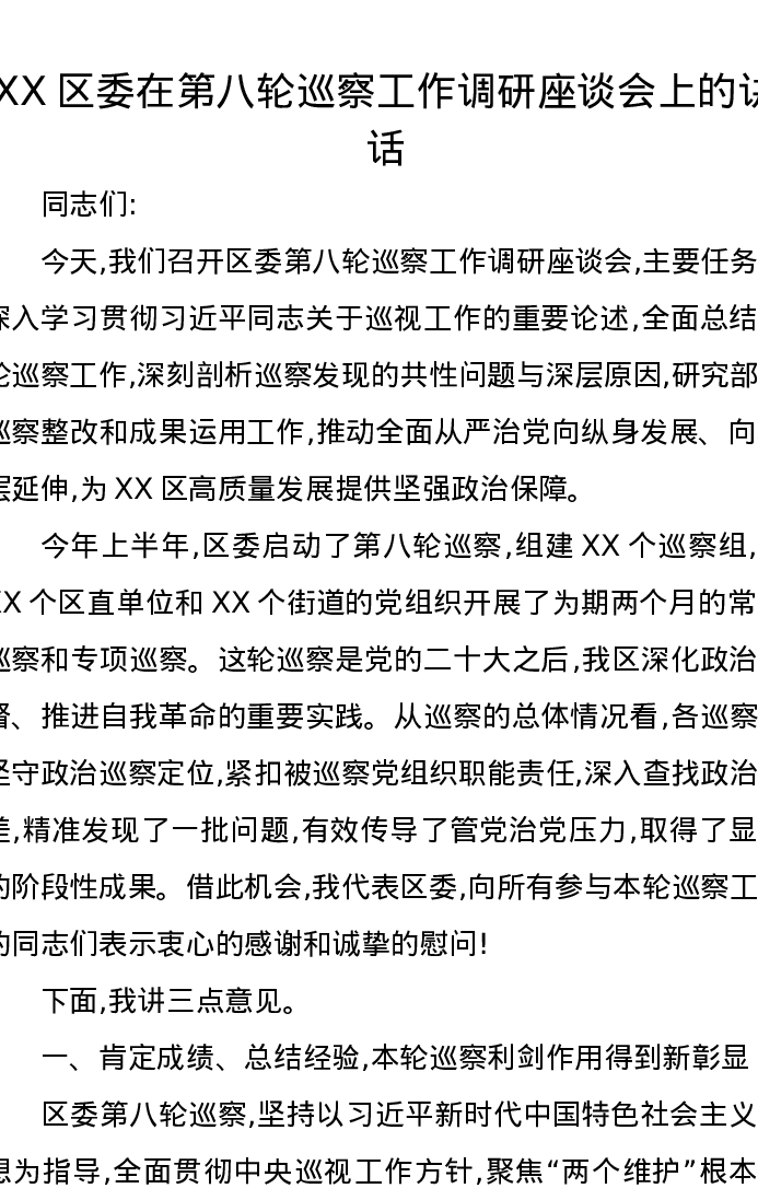 XX区委在第八轮巡察工作调研座谈会上的讲话