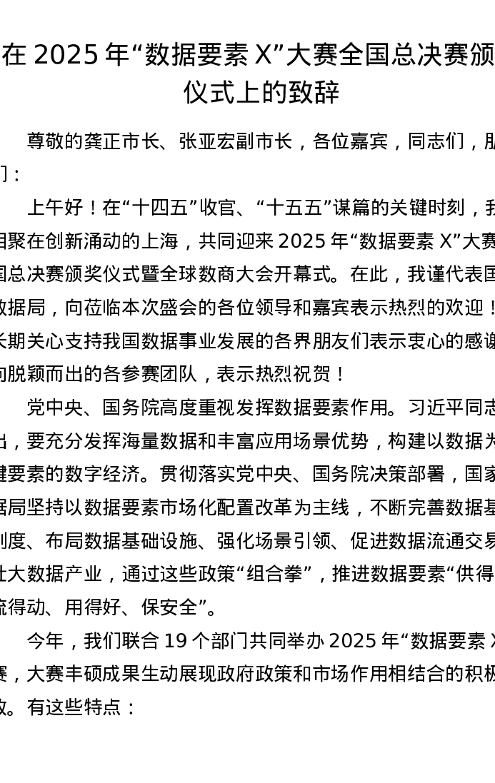 在2025年数据要素X大赛全国总决赛颁奖仪式上的致辞