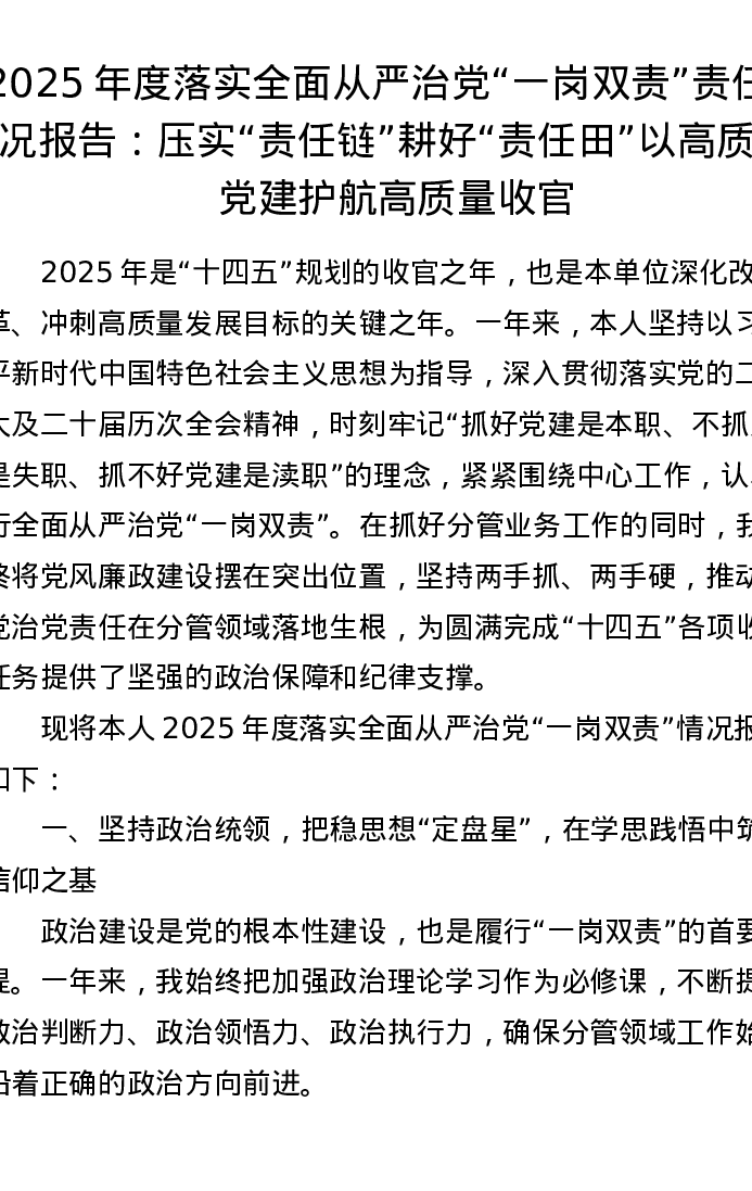2025年度落实全面从严治党一岗双责责任情况报告:压实责任链 耕好责任田 以高质量党建护航高质量收官