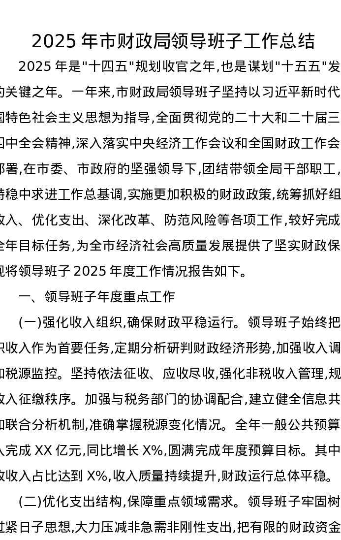 2025年市财政局领导班子工作总结