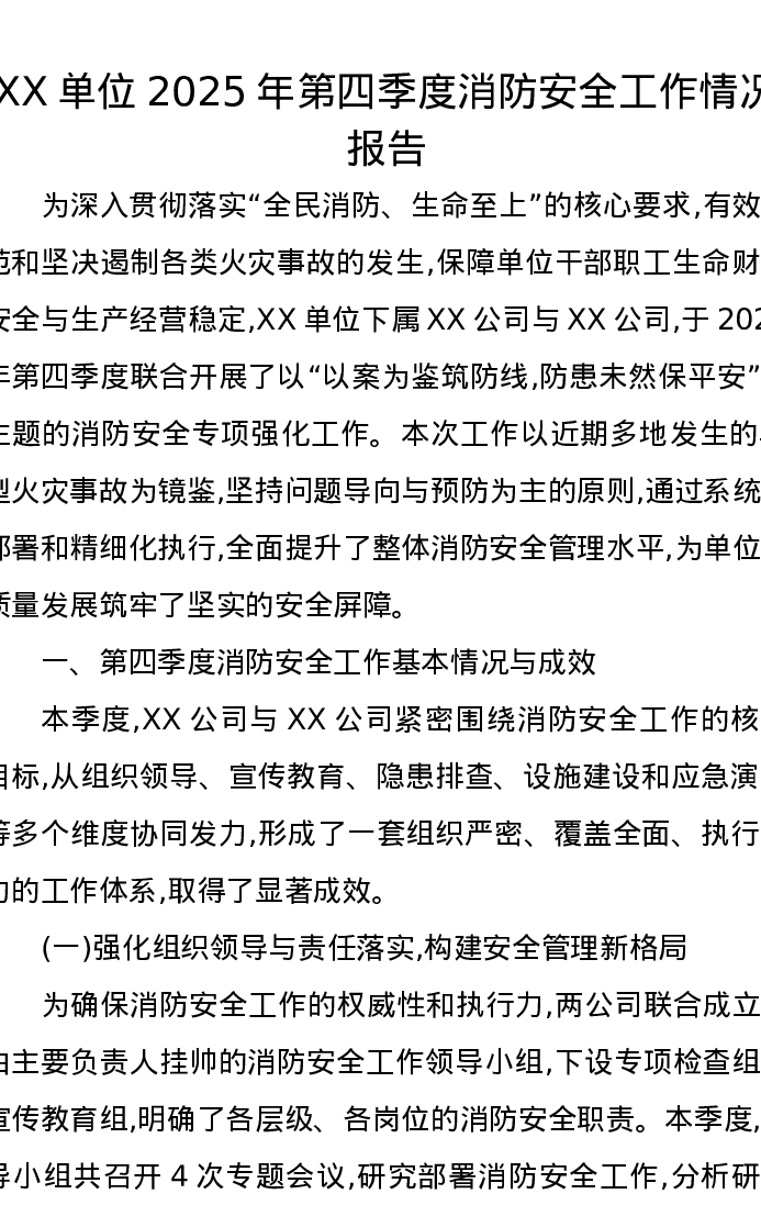 XX单位2025年第四季度消防安全工作情况报告
