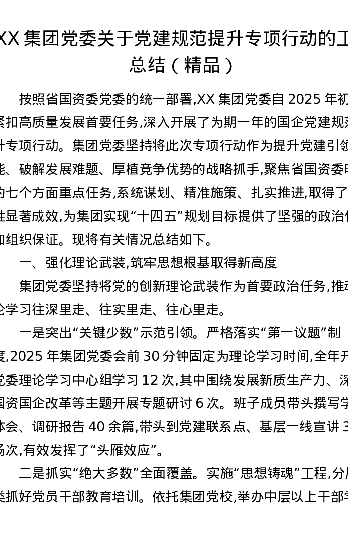 XX集团党委关于党建规范提升专项行动的工作总结