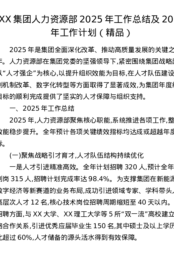 XX集团人力资源部2025年工作总结及2026年工作计划