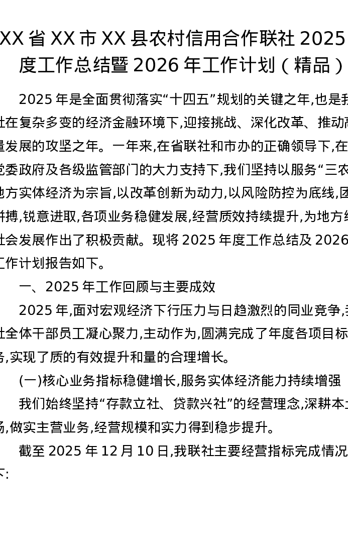 XX省XX市XX县农村信用合作联社2025年度工作总结暨2026年工作计划
