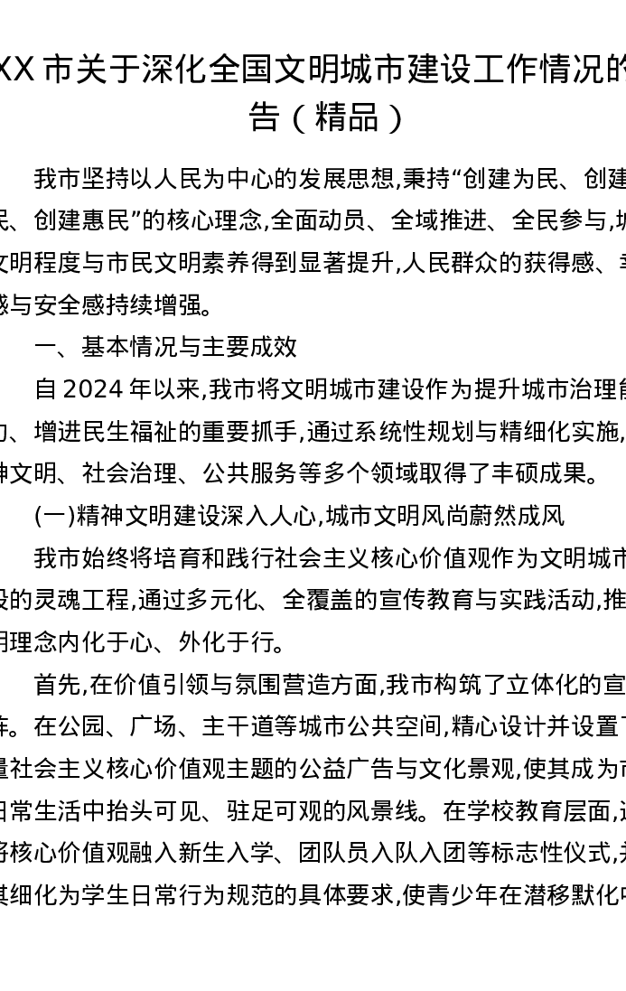 XX市关于深化全国文明城市建设工作情况的报告