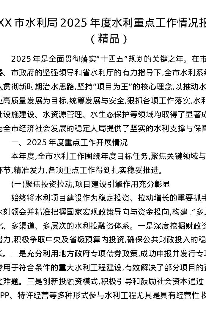 XX市水利局2025年度水利重点工作情况报告