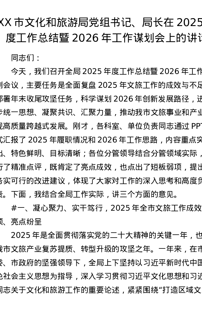 XX市文化和旅游局党组书记、局长在2025年度工作总结暨2026年工作谋划会上的讲话(6387字)