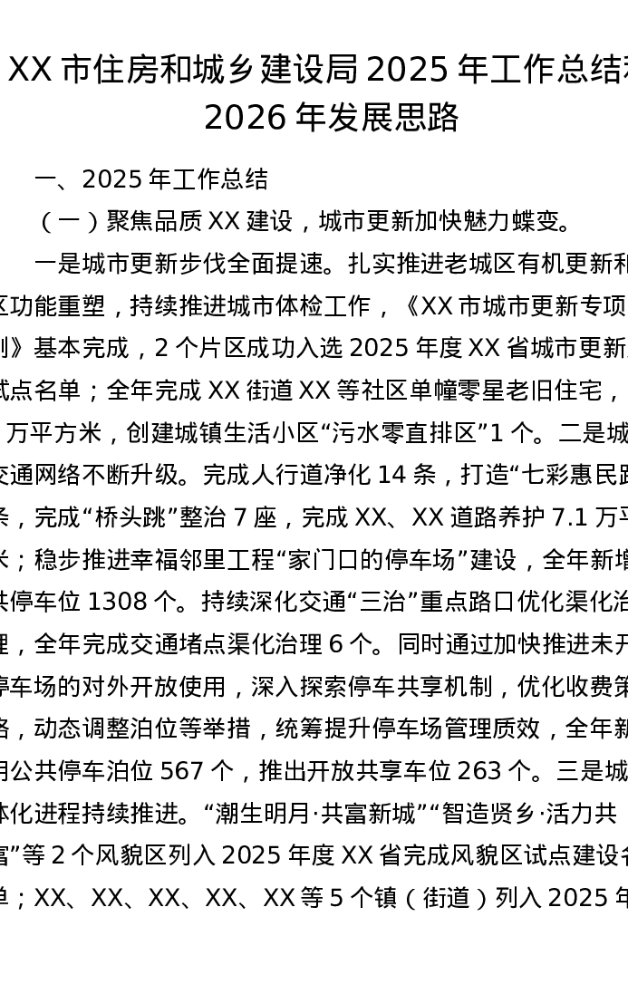 XX市住房和城乡建设局2025年工作总结和2026年发展思路
