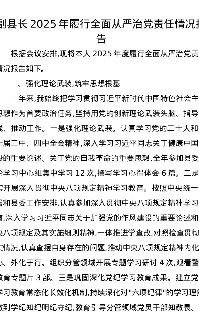 副县长2025年履行全面从严治党责任情况报告