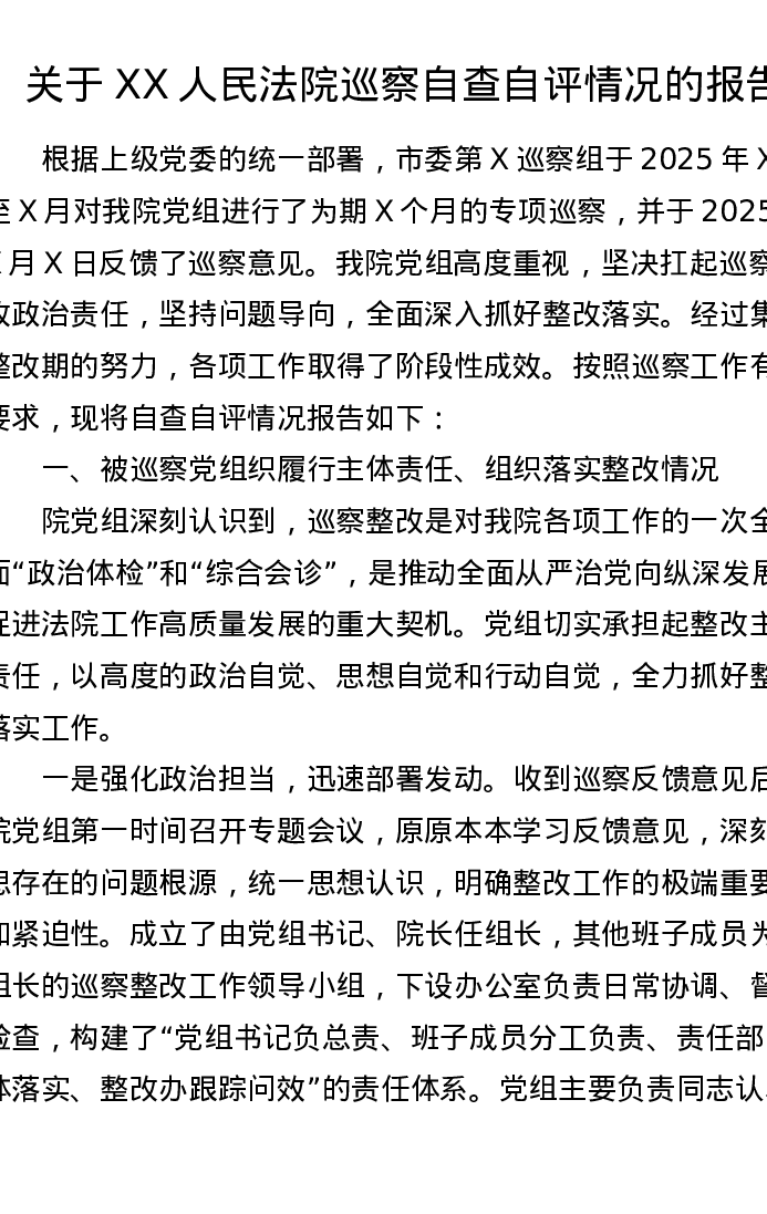 关于XX人民法院巡察自查自评情况的报告(3953字)