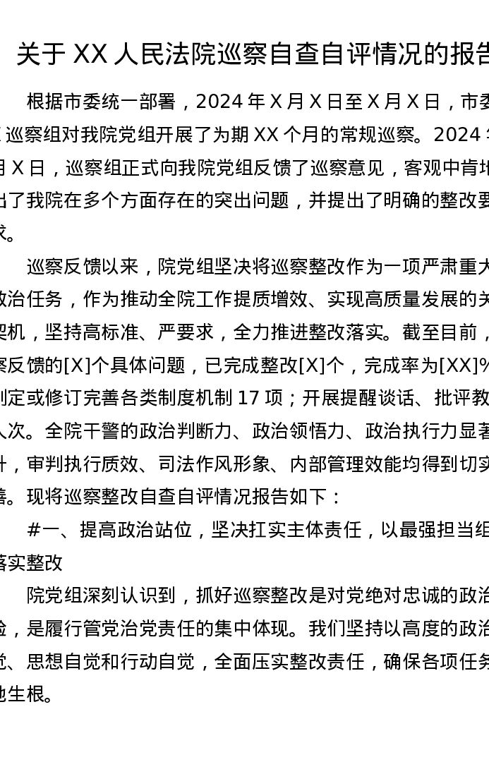 关于XX人民法院巡察自查自评情况的报告(4403字)