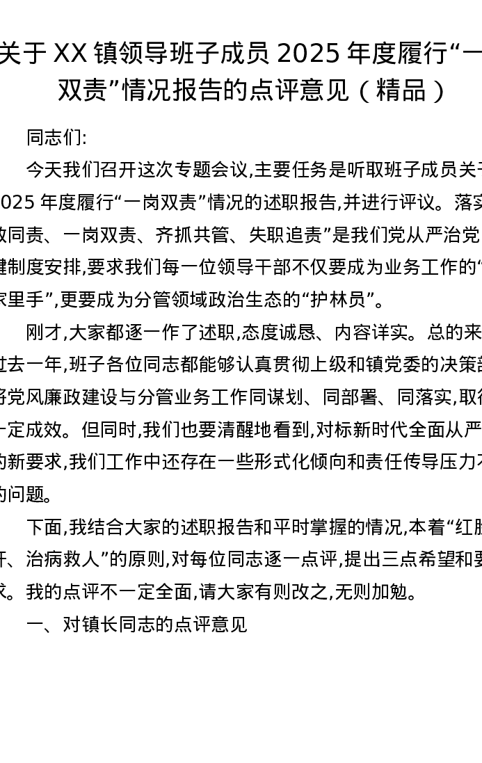 关于XX镇领导班子成员2025年度履行一岗双责情况报告的点评意见