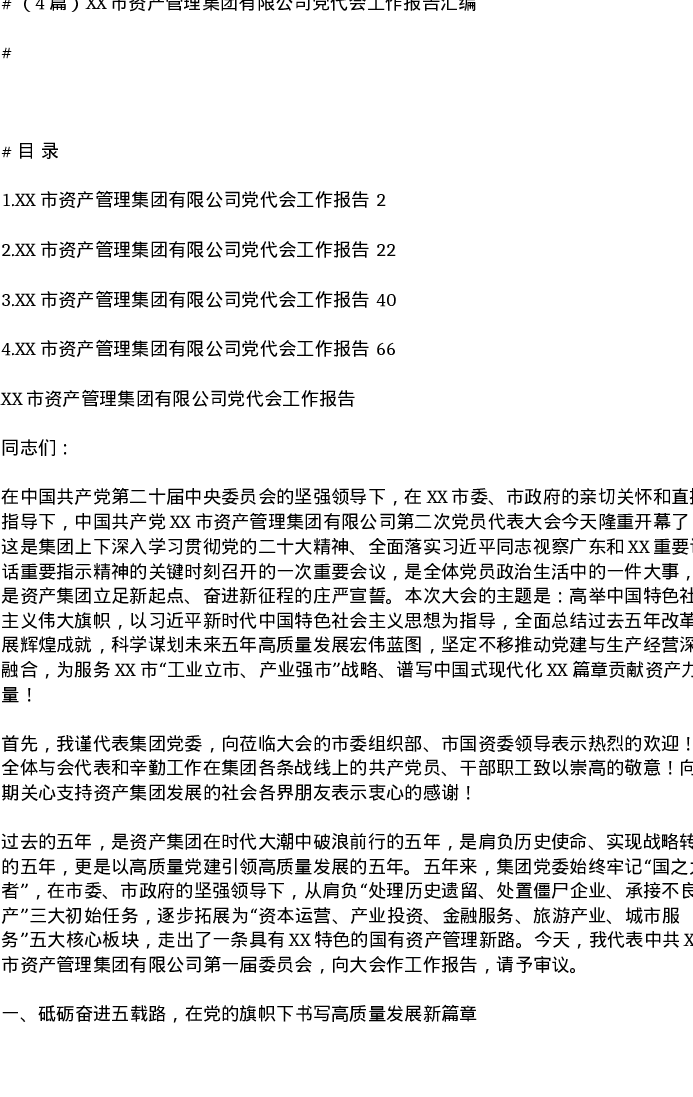 汇编:XX市资产管理集团有限公司党代会工作报告4篇