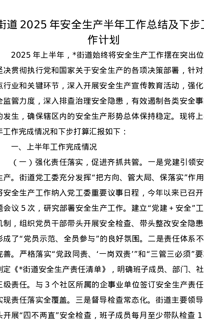 街道2025年安全生产半年工作总结及下步工作计划