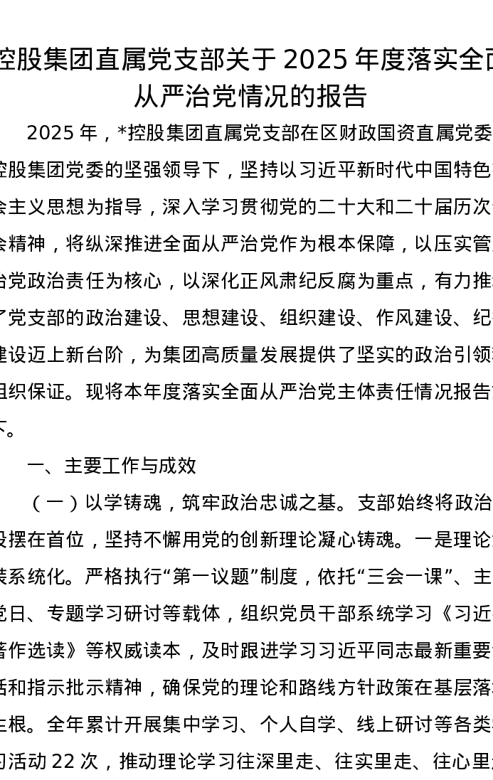 控股集团直属党支部关于2025年度落实全面从严治党情况的报告