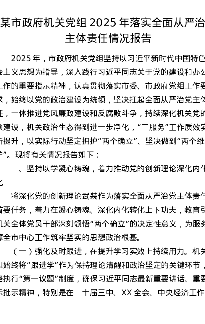 某市政府机关党组2025年落实全面从严治党主体责任情况报告(6713字)