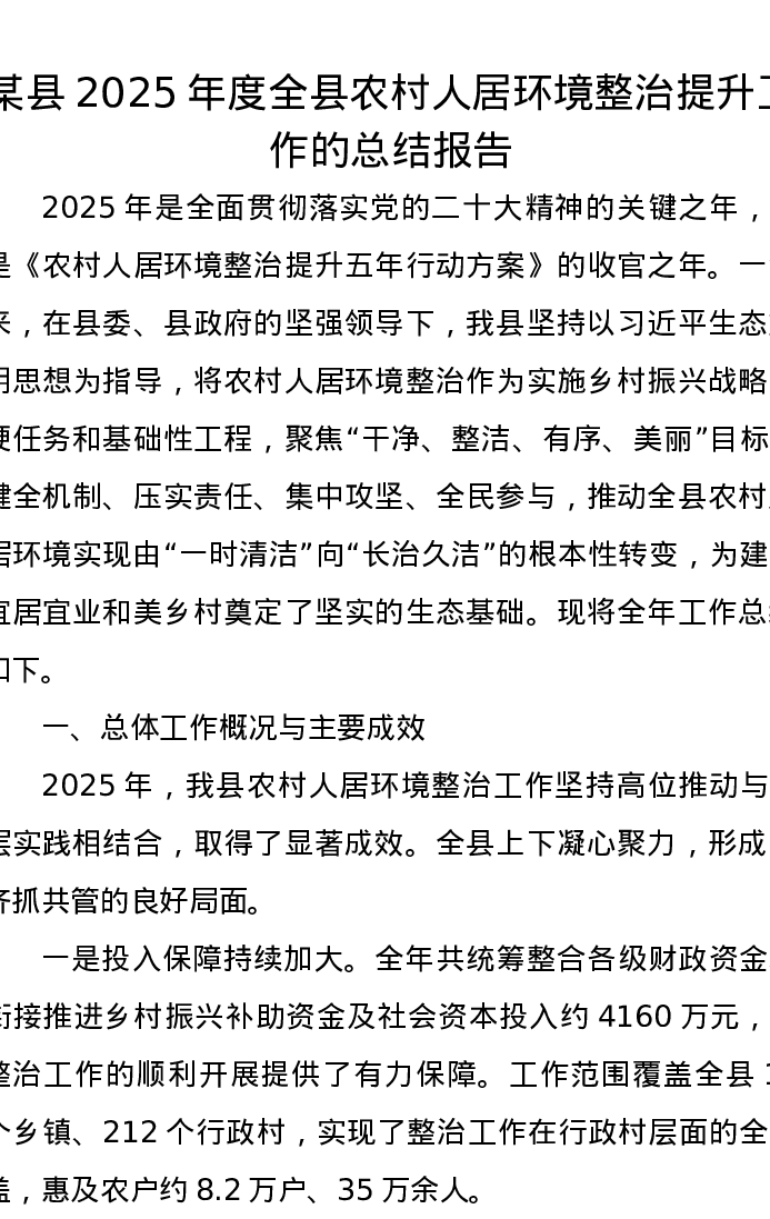 某县2025年度全县农村人居环境整治提升工作的总结报告