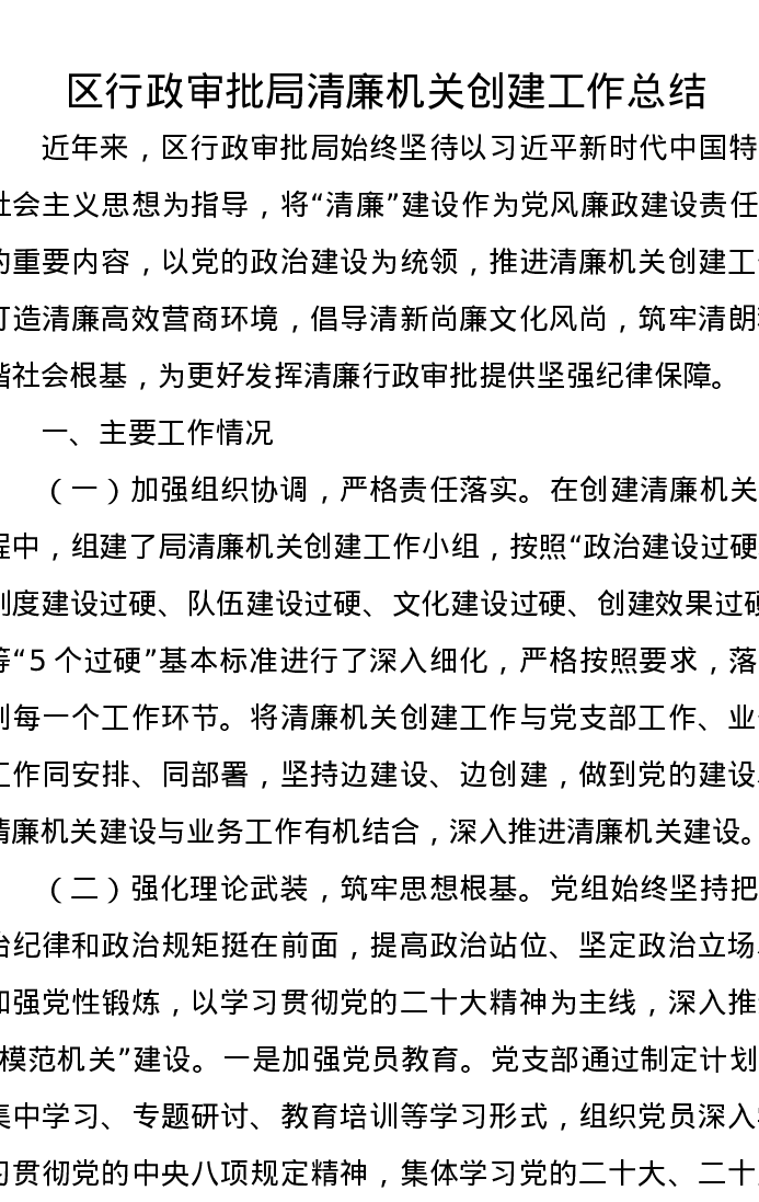 区行政审批局清廉机关创建工作总结