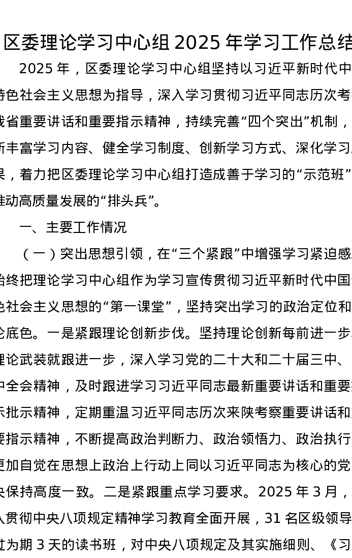 区委理论学习中心组2025年学习工作总结