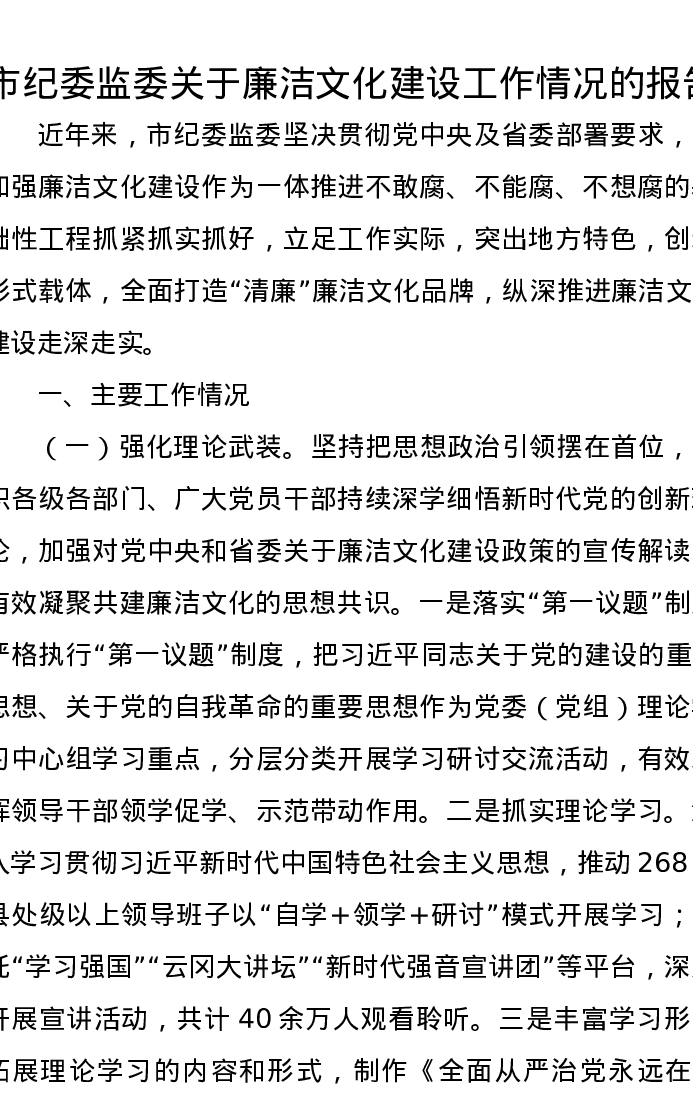 市纪委监委关于廉洁文化建设工作情况的报告