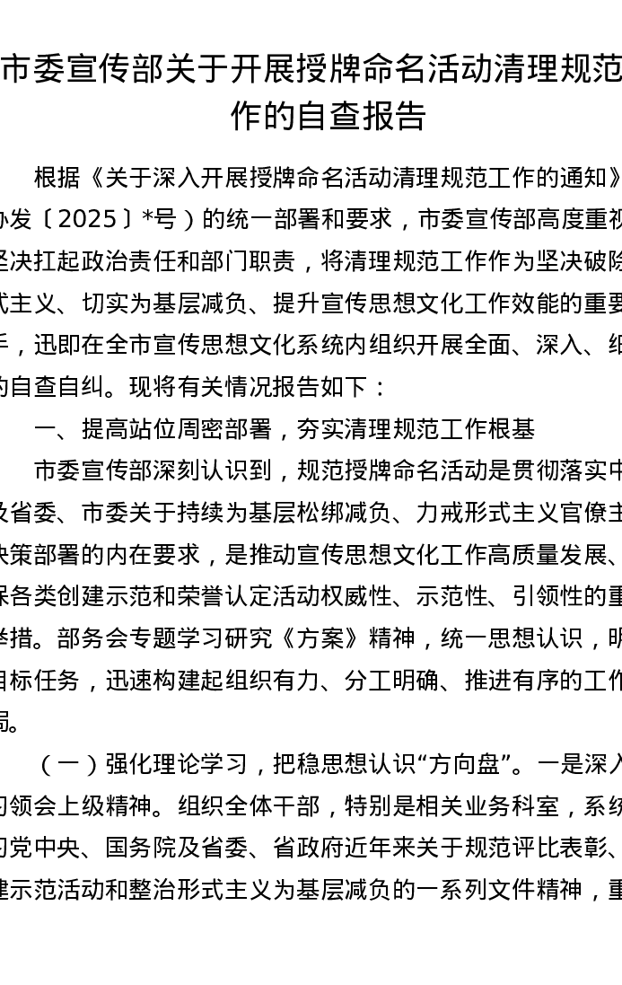 市委宣传部关于开展授牌命名活动清理规范工作的自查报告