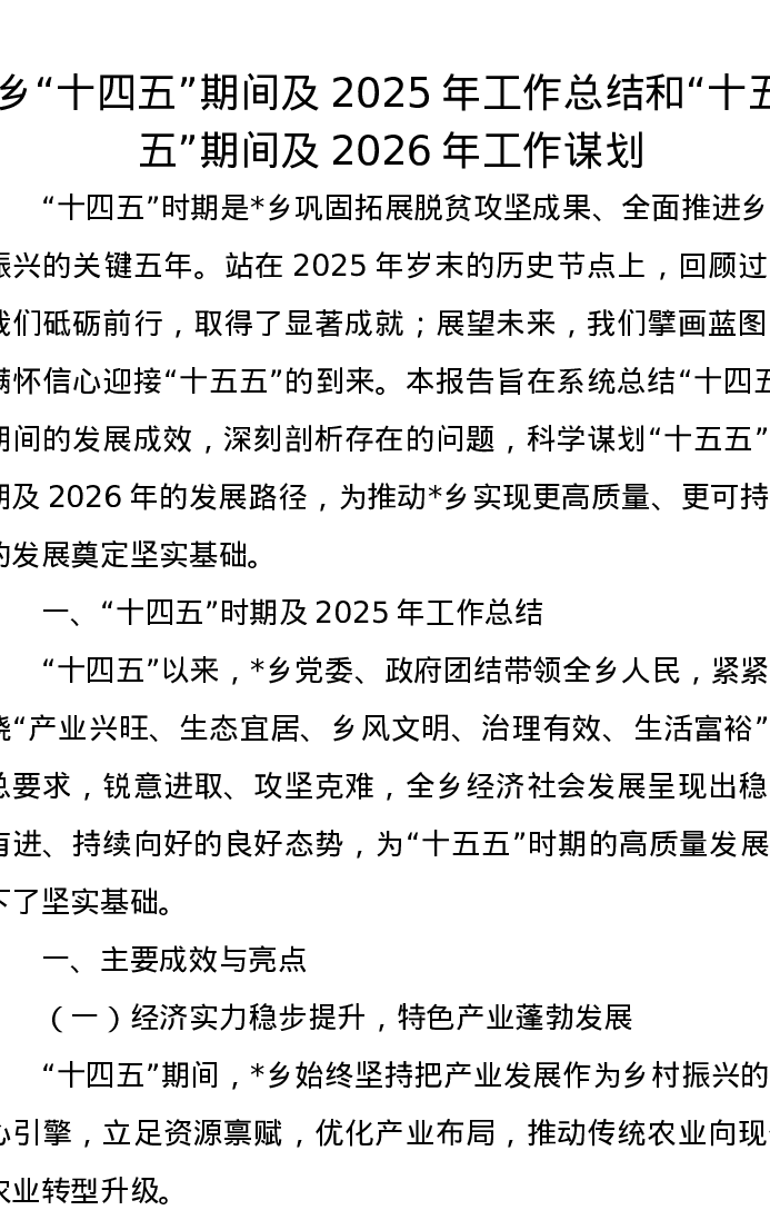 乡十四五期间及2025年工作总结和十五五期间及2026年工作谋划