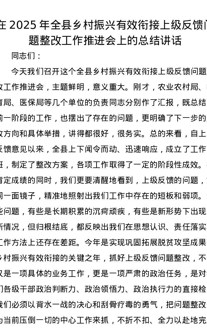 在2025年全县乡村振兴有效衔接上级反馈问题整改工作推进会上的总结讲话