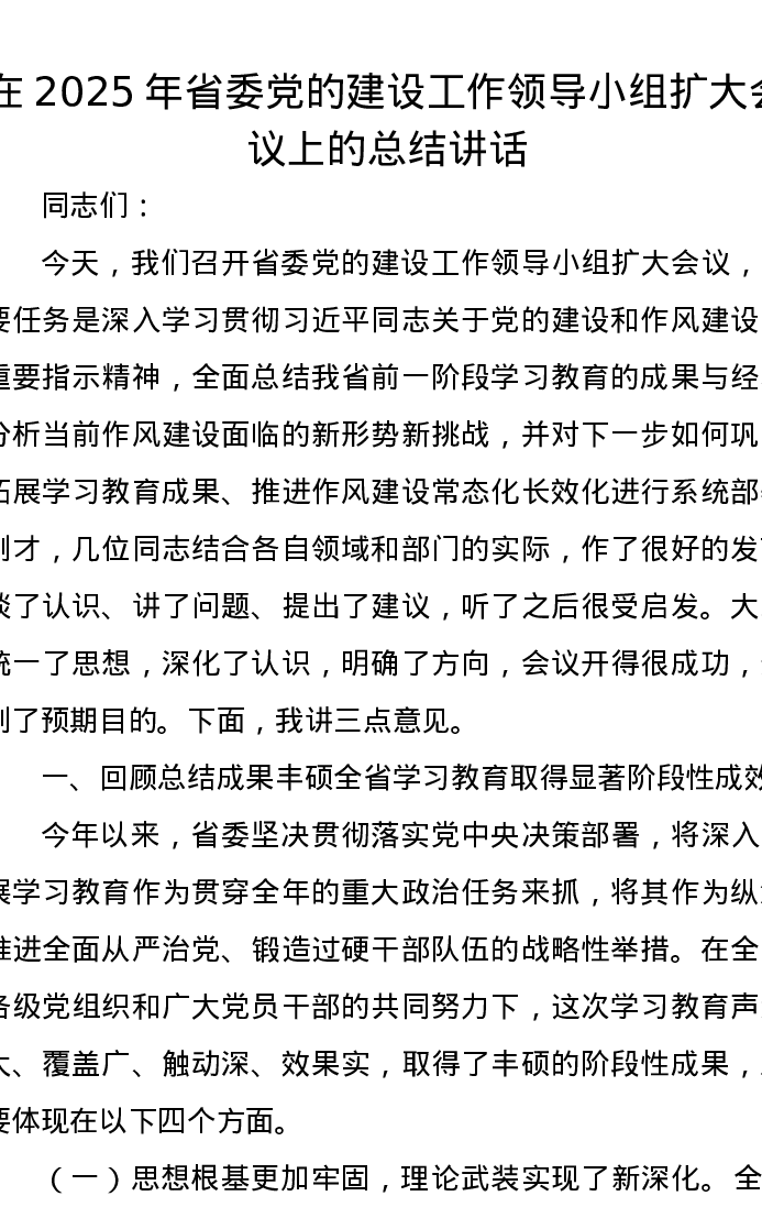 在2025年省委党的建设工作领导小组扩大会议上的总结讲话
