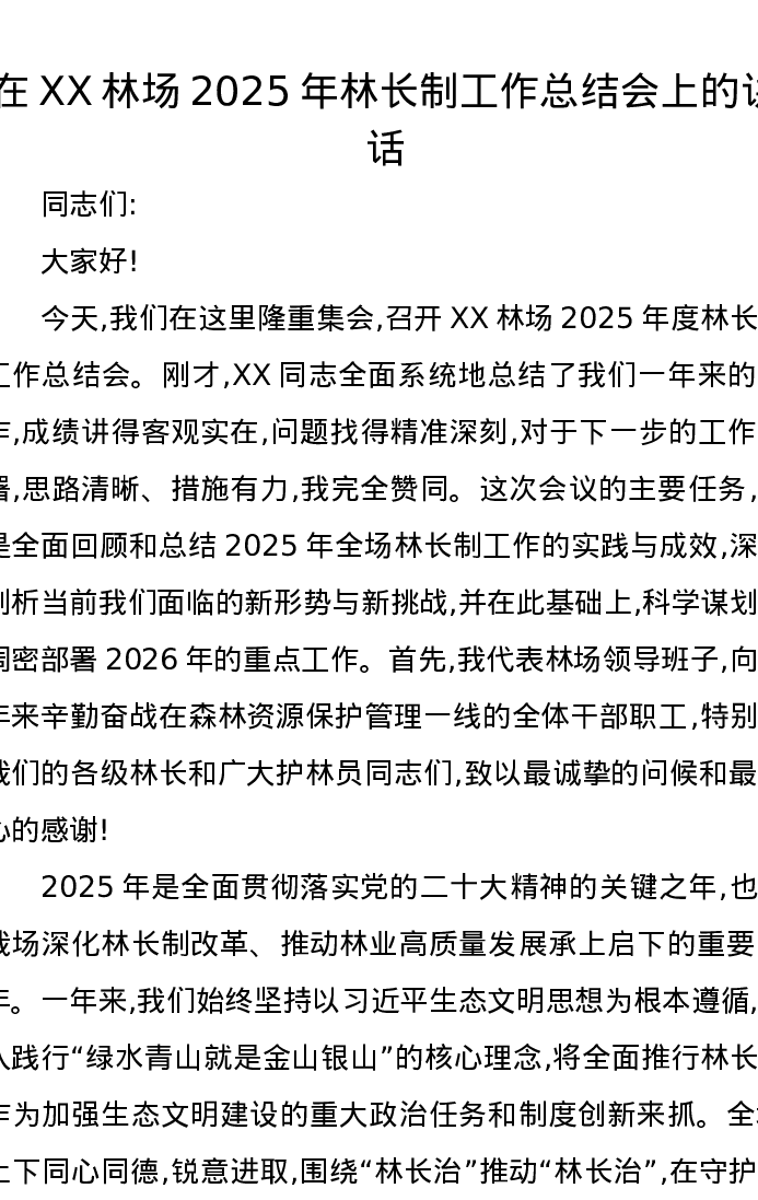 在XX林场2025年林长制工作总结会上的讲话