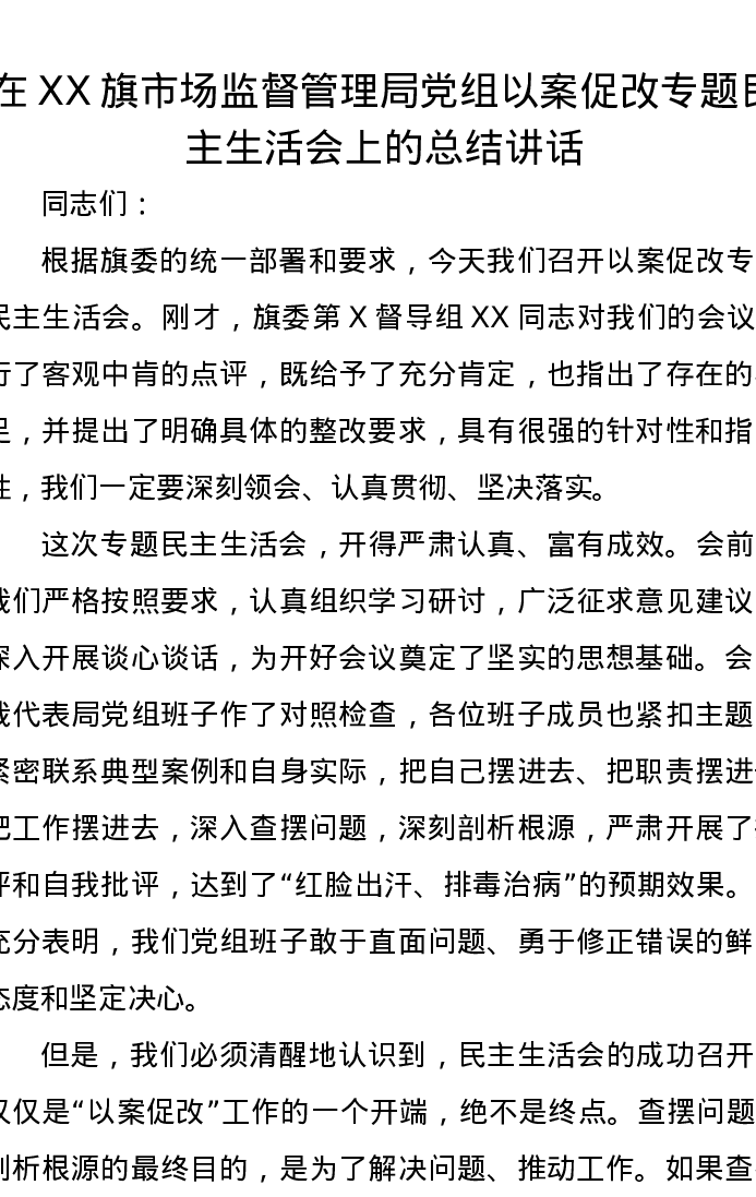 在XX旗市场监督管理局党组以案促改专题xxxxx上的总结讲话