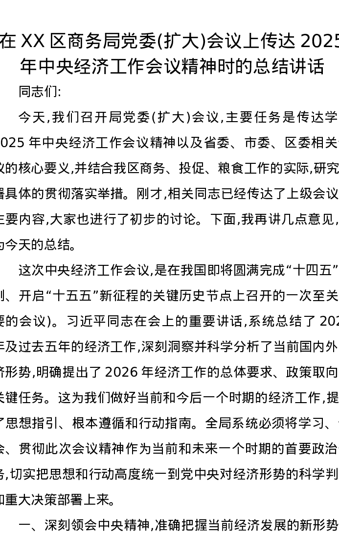 在XX区商务局党委(扩大)会议上传达2025年中央经济工作会议精神时的总结讲话