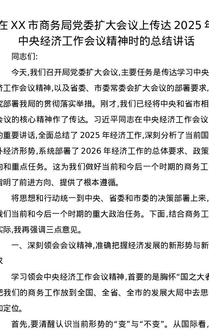 在XX市商务局党委扩大会议上传达2025年中央经济工作会议精神时的总结讲话