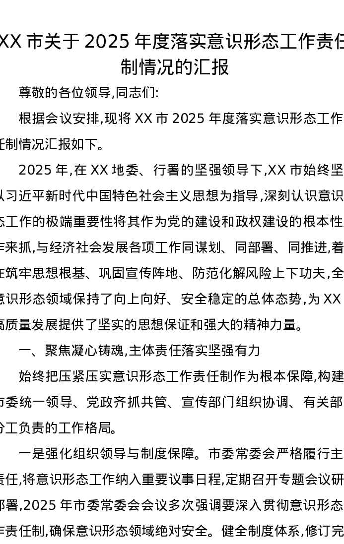 XX市关于2025年度落实意识形态工作责任制情况的汇报