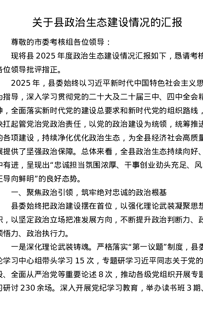 关于县政治生态建设情况的汇报