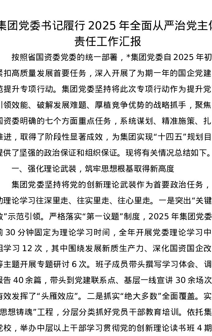 集团党委书记履行2025年全面从严治党主体责任工作汇报